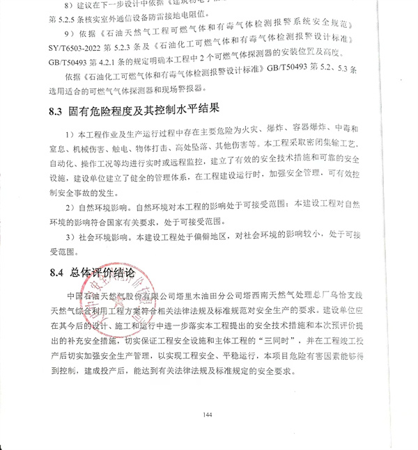 中國石油天然氣股份有限公司塔里木油田分公司塔西南天然氣處理總廠烏恰支線天然氣綜合利用工程方案符合相關法律法規及標準規范對安全生產的要求。建設單位應在其今后的設計、施工和運行中進一步落實本工程提出的安全技術措施和本次預評價提出的補充安全措施,切實保證工程安全設施和主體工程的“三同時”,并在工程竣工投產后切實加強安全生產管理,以實現工程安全、平穩運行,本項目危險有害因素能夠得到控制,建成投產后,能達到有關法律法規及標準規定的安全要求。 |