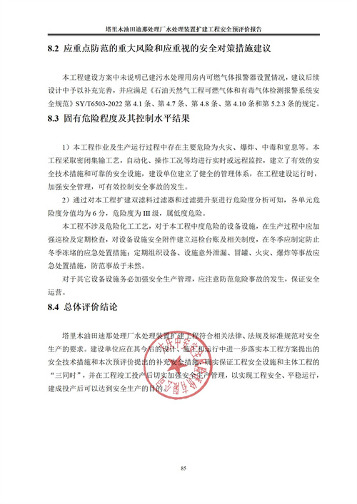 塔里木油田迪那處理廠水處理裝置擴建工程符合相關法律、法規(guī)及標準規(guī)范對安全生產(chǎn)的要求。建設單位應在其今后的設計、施工和運行中進一步落實本工程方案提出的安全技術措施和本次預評價提出的補充安全措施,確實保證工程安全設施和主體工程的“三同時”,并在工程竣工投產(chǎn)后切實加強安全生產(chǎn)管理,以實現(xiàn)工程安全、平穩(wěn)運行,建成投產(chǎn)后可以達到安全生產(chǎn)的目的。 |