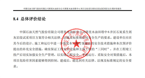 中國石油天然氣股份有限公司塔里木油田分公司塔里木油田塔中6井區(qū)石炭系生屑灰?guī)r段試采項目方案符合相關(guān)法律、法規(guī)及標(biāo)準(zhǔn)規(guī)范對安全生產(chǎn)的要求。建設(shè)單位應(yīng)在其今后的設(shè)計、施工和運(yùn)行中進(jìn)一步落實本工程方案提出的安全技術(shù)措施和本次預(yù)評價提出的補(bǔ)充安全措施,確實保證工程安全設(shè)施和主體工程的“三同時”,并在工程竣工投產(chǎn)后切實加強(qiáng)安全生產(chǎn)管理,以實現(xiàn)工程安全、平穩(wěn)運(yùn)行,采取安全對策措施后,本項目危險有害因素能夠得到控制,建成后,能達(dá)到有關(guān)法律、法規(guī)及標(biāo)準(zhǔn)規(guī)定的安全要求。 |