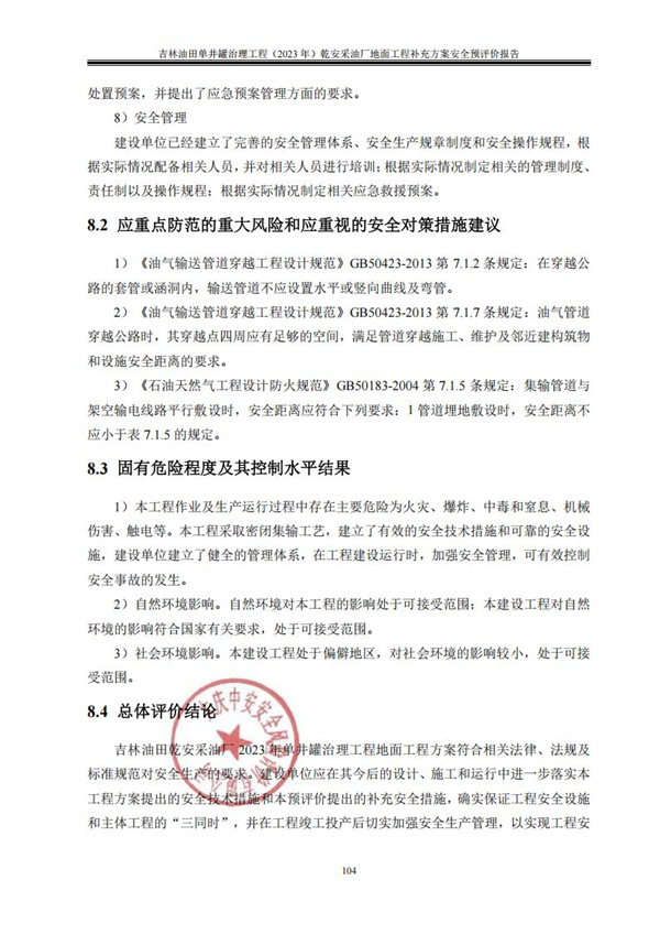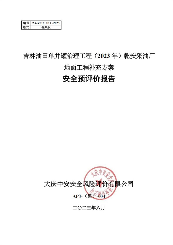 吉林油田單井罐治理工程(2023年)乾安采油廠地面工程補(bǔ)充方案 安全預(yù)評(píng)價(jià) |