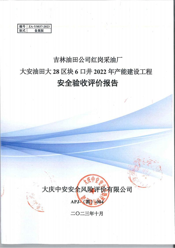 吉林油田公司紅崗采油廠大安油田大28區塊6口井2022年產能建設工程安全驗收評價 |