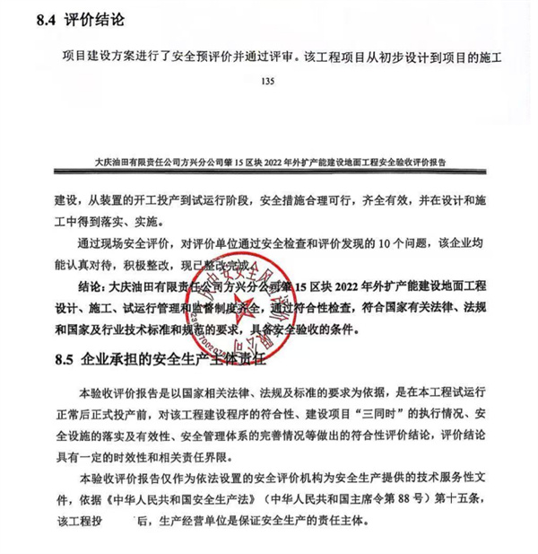 大慶油田有限責任公司方興分公司肇15區塊2022年外擴產能建設地面工程設計、施工、試運行管理和監督制度齊全,通過符合性檢查,符合國家有關法律、法規和國家及行業技術標準和規范的要求,具備安全驗收的條件。