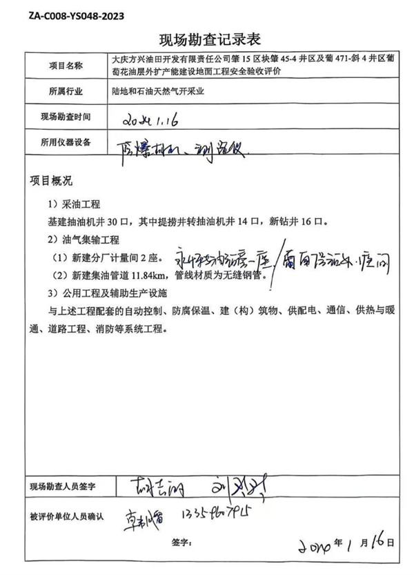 大慶油田有限責(zé)任公司方興分公司肇15區(qū)塊肇45-4井區(qū)及葡471-斜4井區(qū)葡萄花油層外擴(kuò)產(chǎn)能建設(shè)地面工程安全驗(yàn)收評價(jià) |