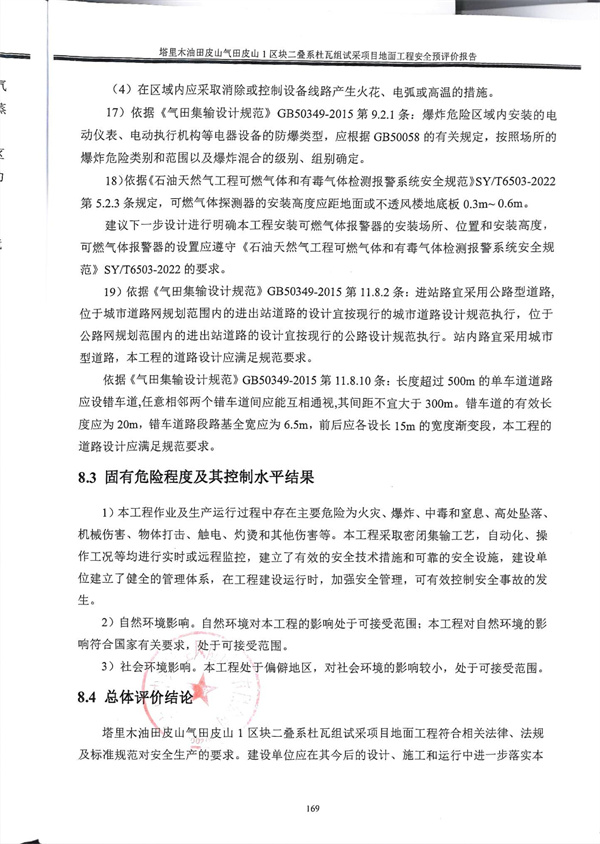 塔里木油田皮山氣田皮山1區塊二疊系杜瓦組試采項目地面工程符合相關法律、法規及標準規范對安全生產的要求。建設單位應在其今后的設計、施工和運行中進一步落實本工程方案提出的安全技術措施和本次預評價提出的補充安全措施,確實保證工程安全設施和主體工程的“三同時”,并在工程竣工投產后切實加強安全生產管理,以實現工程安全、平穩運行,建成投產后符合法律法規要求。 |