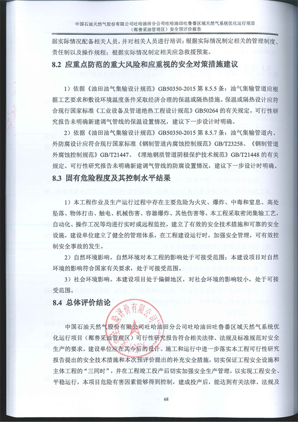 中國石油天然氣股份有限公司吐哈油田分公司吐哈油田吐魯番區(qū)域天然氣系統(tǒng)優(yōu)化運行項目(鄯善采油管理區(qū))可行性研究報告符合相關(guān)法律、法規(guī)及標準規(guī)范對安全生產(chǎn)的要求。建設(shè)單位應(yīng)在其今后的設(shè)計、施工和運行中進一步落實本工程可行性研究報告提出的安全技術(shù)措施和本次預(yù)評價提出的補充安全措施,切實保證工程安全設(shè)施和主體工程的“三同時”,并在工程竣工投產(chǎn)后切實加強安全生產(chǎn)管理,以實現(xiàn)工程安全、平穩(wěn)運行,本項目危險有害因素能夠得到控制,建成投產(chǎn)后,能達到有關(guān)法律、法規(guī)及標準規(guī)定的安全要求。 |