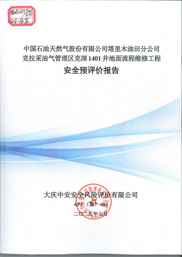 中國(guó)石油天然氣股份有限公司塔里木油田分公司克拉采油氣管理區(qū)克深1401井地面流程維修工程安全預(yù)評(píng)價(jià)報(bào)告 |