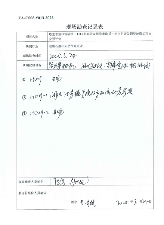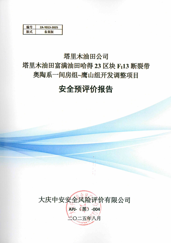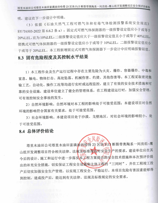 塔里木油田公司塔里木油田富滿油田哈得23區塊FI13斷裂帶奧陶系一間房組~鷹山組開發調整項目安全預評價報告