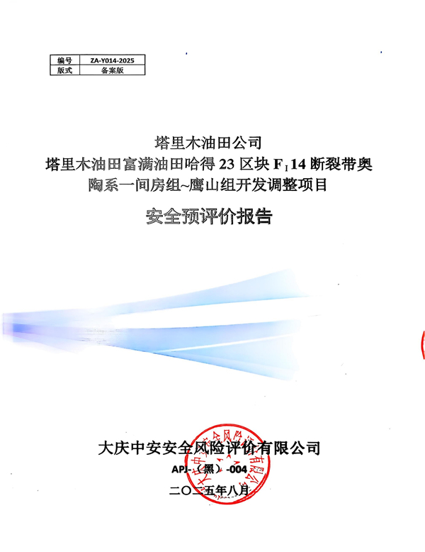 塔里木油田公司塔里木油田富滿油田哈得23區塊FI14斷裂帶奧陶系一間房組~鷹山組開發調整項目安全預評價報告