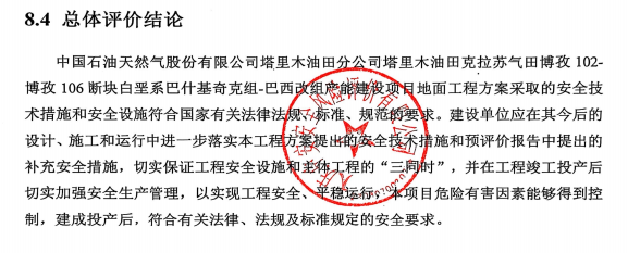 中國石油天然氣股份有限公司塔里木油田分公司塔里木油田克拉蘇氣田博孜102-博孜106斷塊白堊系巴什基奇克組-巴西改組產能建設項目地面工程方案采取的安全技術措施和安全設施符合國家有關法律法規、標準、規范的要求。建設單位應在其今后的設計、施工和運行中進一步落實本工程方案提出的安全技術措施和預評價報告中提出的補充安全措施,切實保證工程安全設施和主體工程的“三同時”,并在工程竣工投產后切實加強安全生產管理,以實現工程安全、平穩運行,本項目危險有害因素能夠得到控制,建成投產后,符合有關法律、法規及標準規定的安全要求。 |