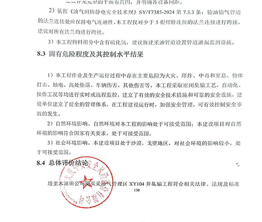 塔里木油田公司英買采油氣管理區XY104井集輸工程安全預評價報告 |