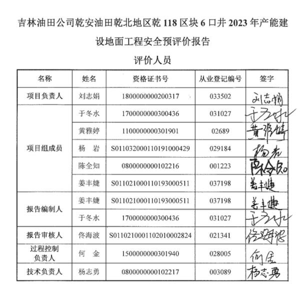 吉林油田公司乾安油田乾北地區乾118區塊6口井2023年產能建設地面工程安全預評價報告 |
