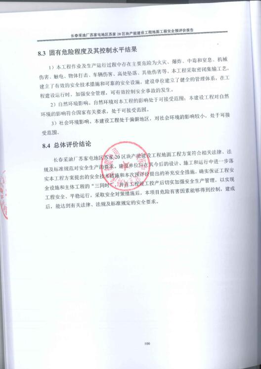 長春采油廠蘇家屯地區蘇家20區塊產能建設工程地面工程方案符合相關法律、法規及標準規范對安全生產的要求。建設單位應在其今后的設計、施工和運行中進一步落實本工程方案提出的安全技術措施和本次預評價提出的補充安全措施,確實保證工程安全設施和主體工程的“三同時”,并在工程竣工投產后切實加強安全生產管理,以實現工程安全、平穩運行,采取安全對策措施后,本項目危險有害因素能夠得到控制,建成后,能達到有關法律、法規及標準規定的安全要求。 |