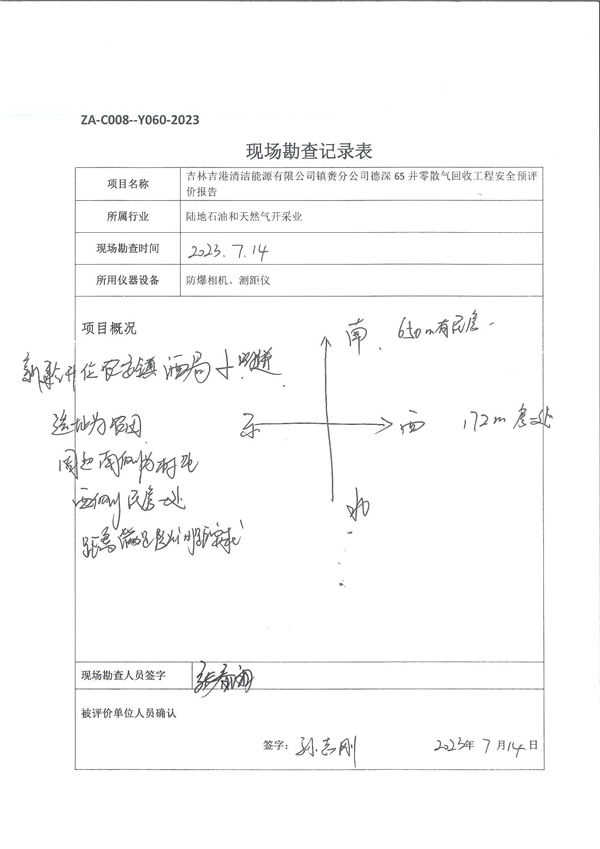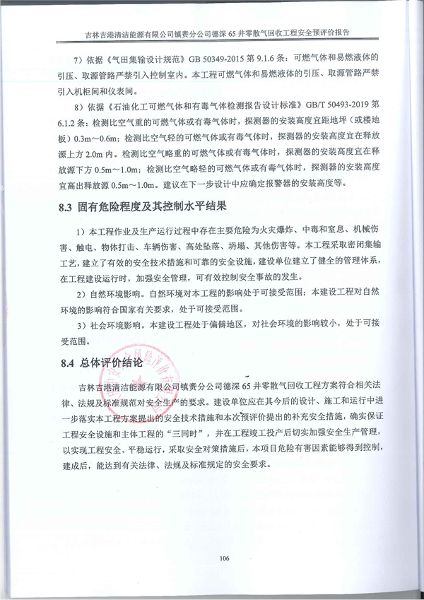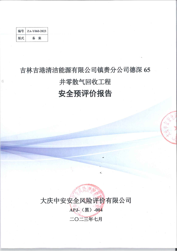 吉林吉港清潔能源有限公司鎮賚分公司德深65井零散氣回收工程安全預評價報告 |