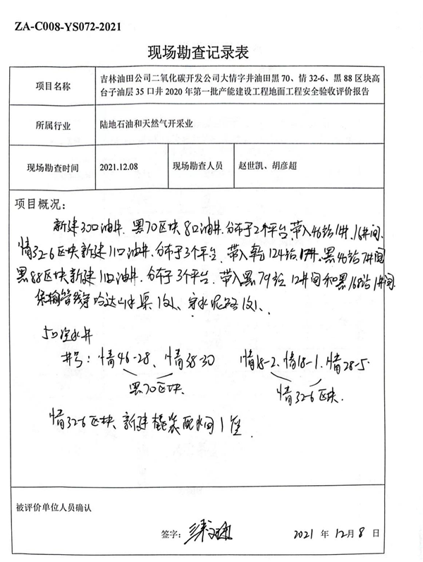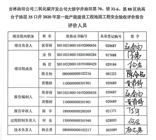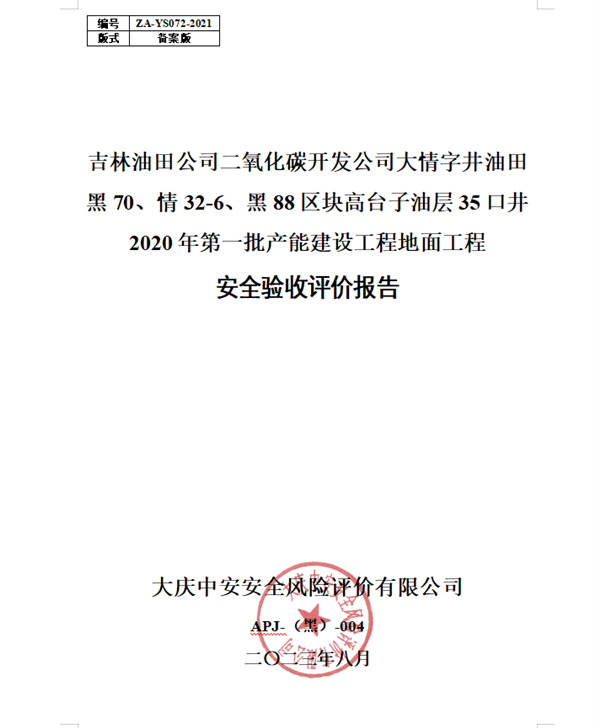 吉林油田公司二氧化碳開發公司大情字井油田黑70、情32-6、黑88區塊高臺子油層35口井2020年第一批產能建設工程地面工程安全驗收評價報告 |