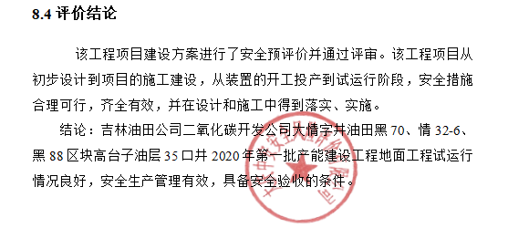 該工程項目建設方案進行了安全預評價并通過評審。該工程項目從初步設計到項目的施工建設,從裝置的開工投產到試運行階段,安全措施合理可行,齊全有效,并在設計和施工中得到落實、實施。 結論:吉林油田公司二氧化碳開發公司大情字井油田黑70、情32-6、黑88區塊高臺子油層35口井2020年第一批產能建設工程地面工程試運行情況良好,安全生產管理有效,具備安全驗收的條件。 |