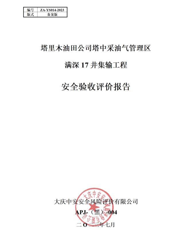 塔里木油田公司塔中采油氣管理區滿深17井集輸工程安全驗收評價 |