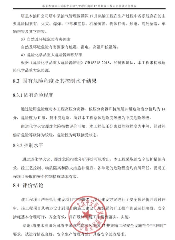 該工程項目嚴格執行建設項目“三同時”,項目建設方案進行了安全預評價并通過評審。該工程項目從初步設計到項目的施工建設,從裝置的開工投產到試運行階段,安全措施基本合理可行,齊全有效,并在設計和施工中得到落實、實施。 結論:塔里木油田公司塔中采油氣管理區滿深17井集輸工程安全設施符合“三同時”要求,試運行情況良好,安全生產管理有效,具備安全驗收要求。 |