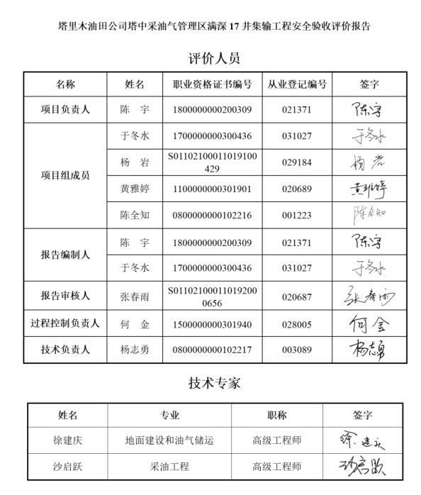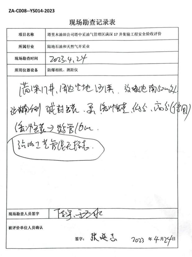 塔里木油田公司塔中采油氣管理區滿深17井集輸工程安全驗收評價