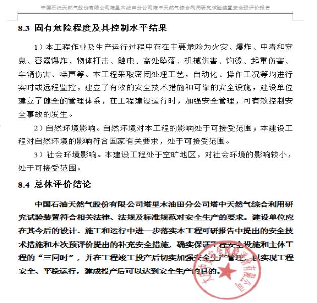 中國石油天然氣股份有限公司塔里木油田分公司塔中天然氣綜合利用研究試驗裝置符合相關法律、法規及標準規范對安全生產的要求。建設單位應在其今后的設計、施工和運行中進一步落實本工程可研報告中提出的安全技術措施和本次預評價提出的補充安全措施,確實保證工程安全設施和主體工程的“三同時”,并在工程竣工投產后切實加強安全生產管理,以實現工程安全、平穩運行,建成投產后可以達到安全生產的目的。 |