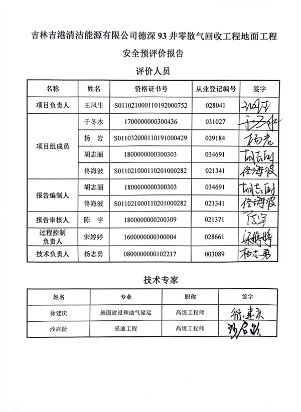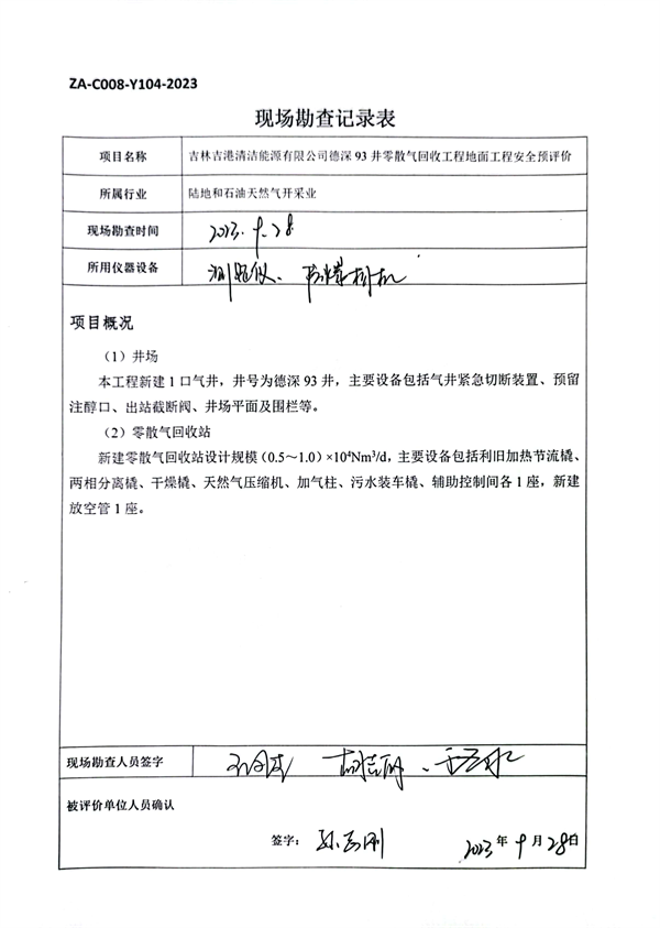 吉林吉港清潔能源有限公司德深93井零散氣回收工程地面工程安全預評價