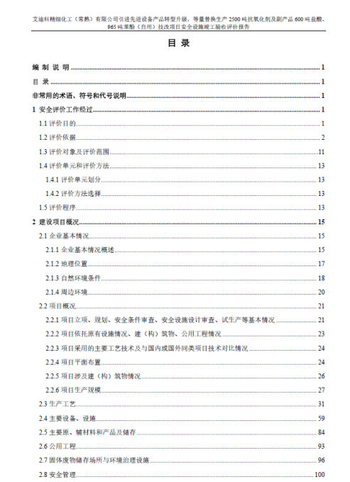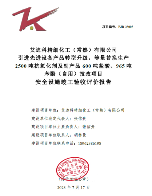 艾迪科精細化工(常熟)有限公司引進先進設備產品轉型升級,等量替換生產2500噸抗氧化劑及副產品600噸鹽酸、965噸苯酚(自用)技改項目 安全設施竣工驗收評價報告