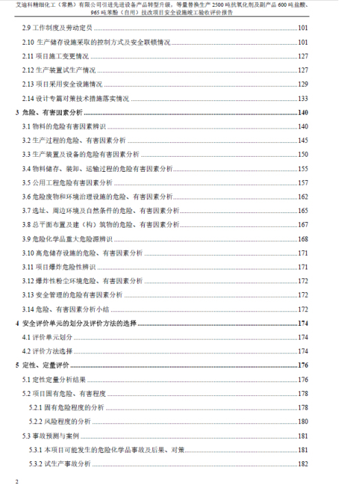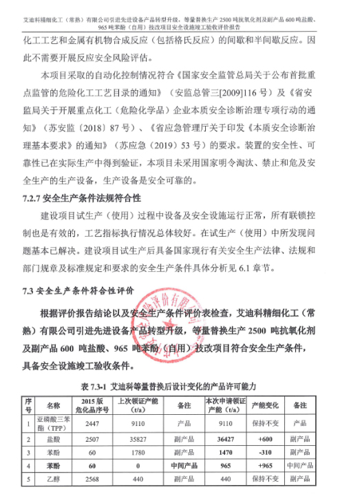 艾迪科精細化工(常熟)有限公司引進先進設備產品轉型升級,等量替換生產2500 噸抗氧化劑及副產品600 噸鹽酸、965 噸苯酚(自用)技改項目符合安全生產條件,具備安全設施竣工驗收條件。 |