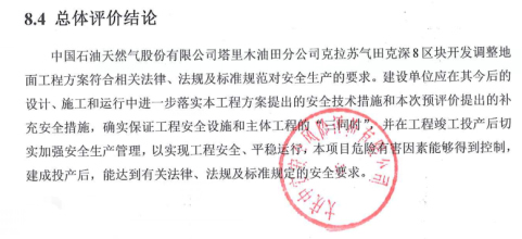 中國石油天然氣股份有限公司塔里木油田分公司克拉蘇氣田克深8區塊開發調整地面工程方案符合相關法律、法規及標準規范對安全生產的要求。建設單位應在其今后的設計、施工和運行中進一步落實本工程方案提出的安全技術措施和本次預評價提出的補充安全措施,確實保證工程安全設施和主體工程的“三同時”,并在工程竣工投產后切實加強安全生產管理,以實現工程安全、平穩運行,本項目危險有害因素能夠得到控制,建成投產后,能達到有關法律、法規及標準規定的安全要求。 |