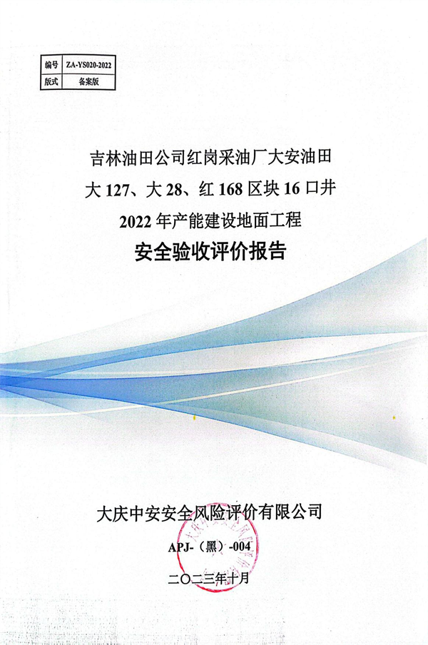 吉林油田公司紅崗采油廠大安油田大127、大28、紅168區塊16口井2022年產能建設地面工程安全驗收評價報告 |