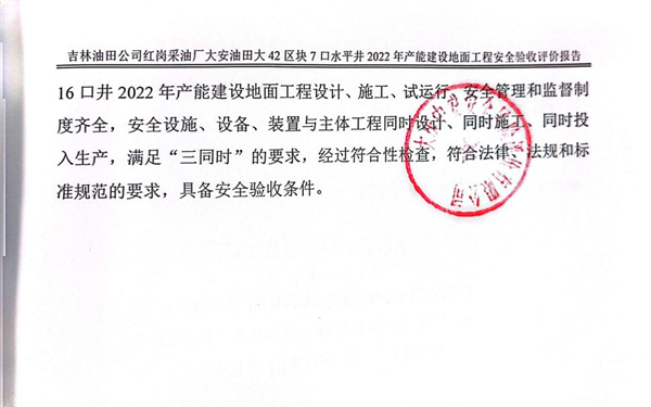 吉林油田公司紅崗采油廠大安油田大127、大28、紅168區塊16口井2022年產能建設地面工程設計、施工、試運行、安全管理和監督制度齊全,安全設施、設備、裝置與主體工程同時設計、同時施工、同時投入生產,滿足“三同時”的要求,經過符合性檢查,符合法律、法規和標準規范的要求,具備安全驗收條件。 |