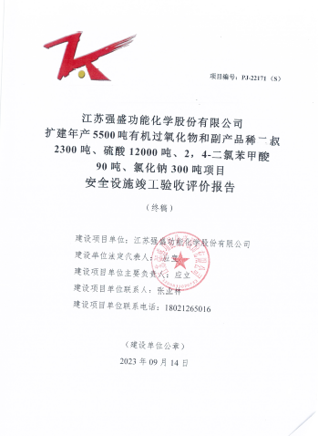 江蘇強盛功能化學股份有限公司擴建年產5500噸有機過氧化物 和副產品稀二叔2300噸、硫酸12000噸、2,4-二氯苯甲酸90噸、氯化鈉300噸項目安全設施竣工驗收評價報告