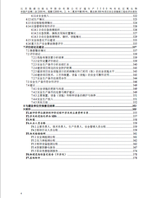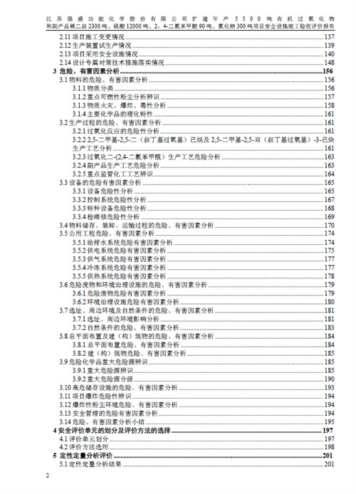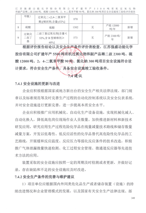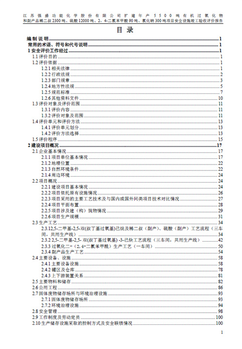 江蘇強盛功能化學股份有限公司擴建年產5500噸有機過氧化物 和副產品稀二叔2300噸、硫酸12000噸、2,4-二氯苯甲酸90噸、氯化鈉300噸項目安全設施竣工驗收評價報告 |