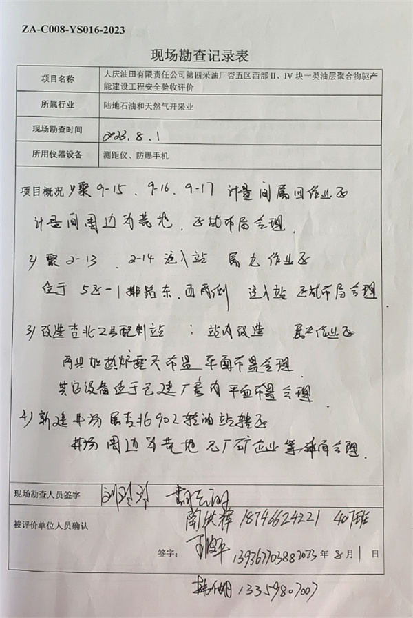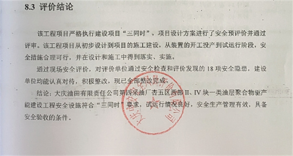 結論:大慶油田有限責任公司第四采油廠杏五區西部II、IV塊一類油層聚合物驅產能建設工程安全設施符合“三同時”要求,試運行情況良好,安全生產管理有效,具備安全驗收的條件。 |