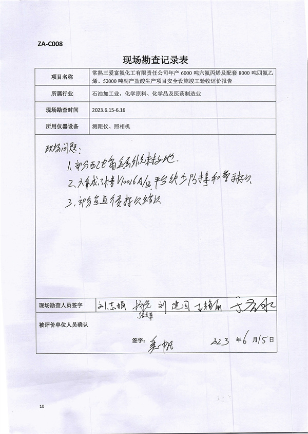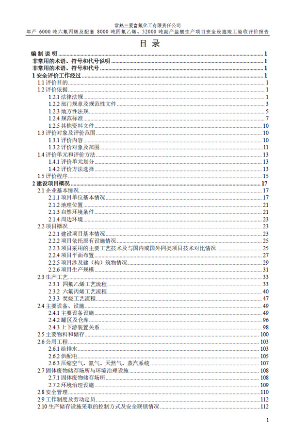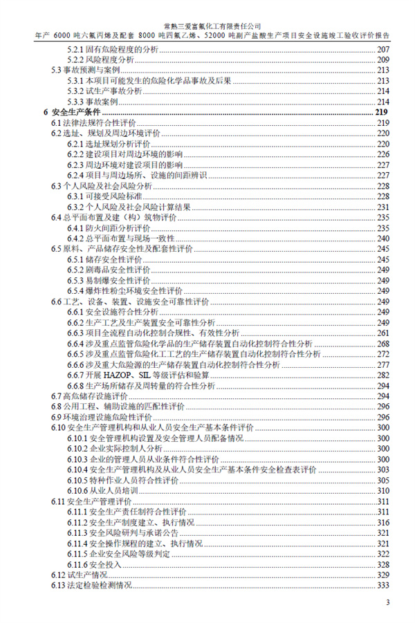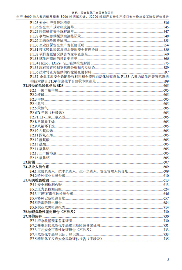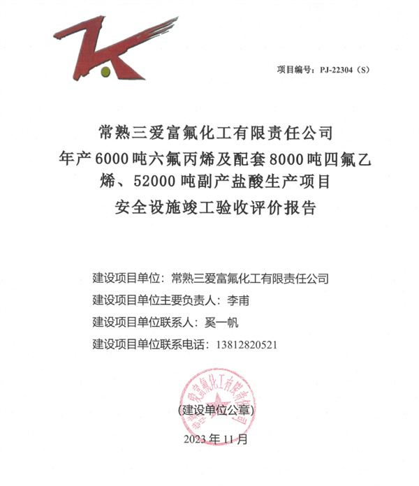 常熟三愛富氟化工有限責任公司年產6000噸六氟丙烯及配套8000噸四氟乙烯、52000噸副產鹽酸生產項目安全設施竣工驗收評價報告 |