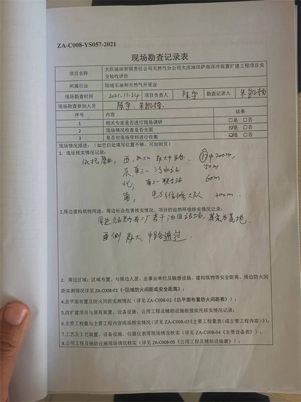 該工程嚴格執行建設項目“三同時”,項目建設方案進行了安全預評價并通過評審。該工程項目從初步設計到項目的施工建設,從裝置的開工投產到試運行階段,安全措施合理可行,齊全有效,并在設計和施工中得到落實、實施。 通過現場安全評價,對評價單位通過安全檢查和評價發現的2個問題,天然氣分公司均能認真對待,積極整改,現已整改完成。 結論:大慶油田有限責任公司天然氣分公司大慶油田薩南深冷裝置擴建工程項目安全設施符合“三同時”要求,具備安全驗收的條件。 |