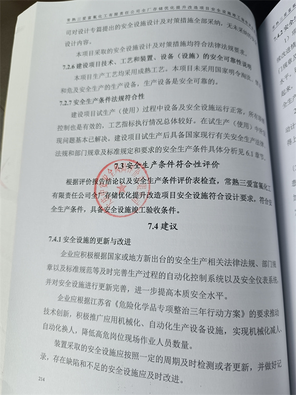 常熟三愛富氟化工有限責任公司全廠存儲優化提升改造項目安全設施符合設計要求,符合安全生產條件,具備安全設施竣工驗收條件 |